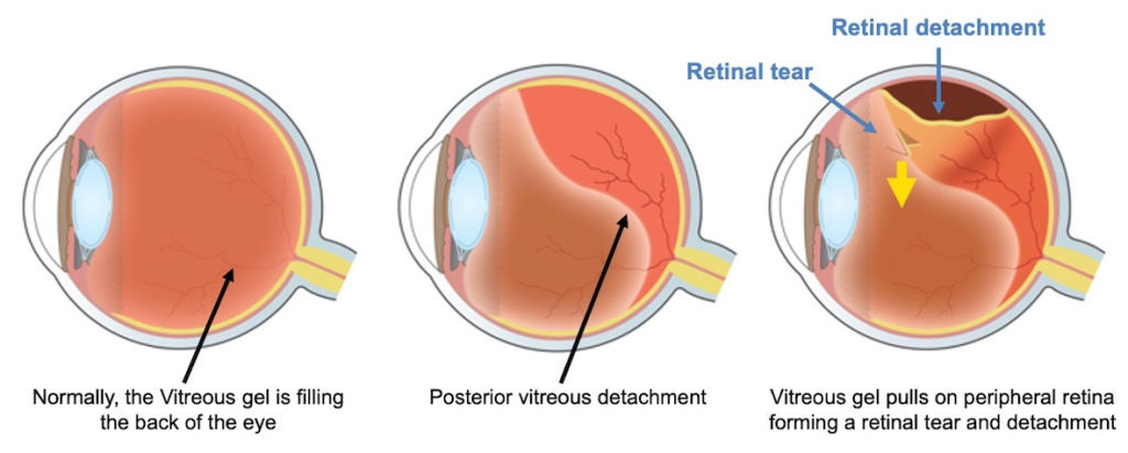 Desgarro de Retina: Un desgarro de retina puede ocurrir cuando el vítreo se desprende y tira de la retina. Durante el proceso de desprendimiento, el humor vítreo puede ejercer una fuerza traccional sobre la retina, especialmente en áreas donde la adherencia entre el vítreo y la retina es más fuerte. Esta tracción puede causar que la retina se rasgue, creando un desgarro.